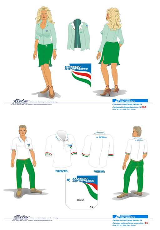 The SÃO FRANCISCO Express, an intermunicipal district and urban bus mass transport company from Nilopolis District / Rio de Janeiro State / Brazil Employees Uniforms Visual Identity embroidered details. For male and Female Adminitration Uniforms.