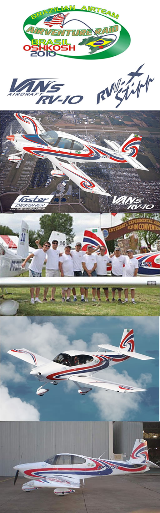 FLYER / VAN`s RV-10, Aircraft for travel in Air Raid with more two other RV-10s. This Raid started in Amarais (Campinas / SP. - BRAZIL) to EAA - AIR VENTURE 2010 / OSHKOSH - USA and finished back at the same airport in BRAZIL. VAN`s RV-10 Vinyl Squeme perspective flying over EAA - AIR VENTURE 2010 On top , signs and logotypes designed for this aircraft and your owner for this Raid. Photo in OSHKOSH with all crews who traveled in this RAID and back. ( Photos by FLYER and BRAZILIAN AIR TEAM - OSHKOSH 2010 )