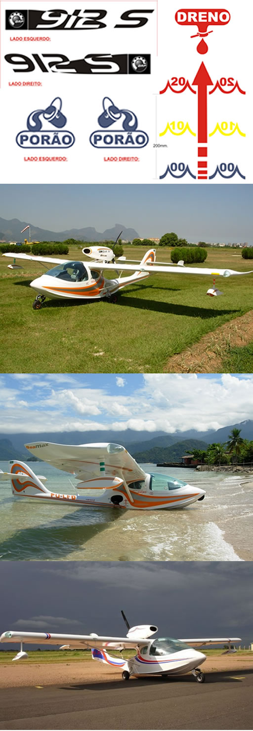 New SEAMAX, The Brasilian Anphibious Lightweight Aircraft PU- LFD at CEU Club in Jacarepaguá and on one island beach at Baia da Ilha Grande in Rio de Janeiro State. Other old SEAMAX , PU - JOT at Rio Grande do Sul State / BRAZIL Both are afull aircraft vynil scheme Design and exterior special safety inscriptions. On top, new external special scriptions for engine power ( ROTAX ) , for the aircraft hold, for the principal landing gears drains and external sea water levels marks. ( This special external inscriptions and logos are only for FOSTER DESIGNER clients. )
