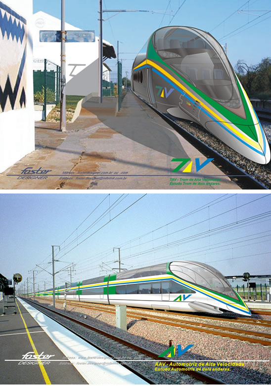 Design de Transporte de Massas com a proposta de que o Brasil tenha os seus TAVs ou AAVs, projetados por Engenheiros & Designers Brasileiros, em conjunto com a tecnologia do vencedor da concorrência. As ilustrações ao lado mostram a nossa sugestão de TAV. (Trens) & AAV. (Automotrizes) de altíssima velocidade, aerodinâmicos e com dois andares para nosso meio - ambiente especial e as longas distâncias continentais.